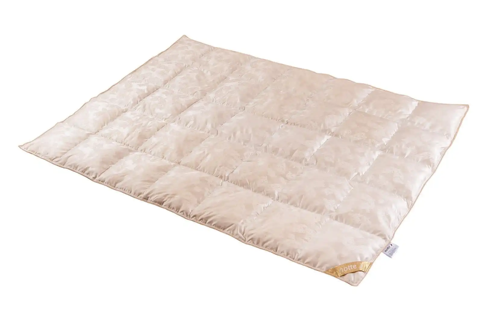 Kołdra Notte Dolce to produkt z najbardziej luksusowej kolekcji. Wyrób został wykonany z najlepszych surowców. Poszycie składa się ze 100% jedwabiu, a wypełnienie to najlepiej wyselekcjonowany puch gęsi. Kołdra została obszyta piękną, elegancją złotą lamówką. Kołdra została uszyta w Polsce ręcznie, z dbałością o każdy szczegół. Kołdry jedwabne zostały wypełnionone taką ilością puchu, aby tworzyła idealną warstwę izolacyjną przy zachowaniu niskiej wagi. Produkt rewelacyjnie sprawdzi się w okresach przejściowych i w zimniejszym sezonie. Najwyższa jakość wykonania gwarantuje trwałość i najlepszą jakość produktu. Wypełnienie składa się z 93% puchu, które określa się według normy Japońskiej jako najlepsze na świecie.