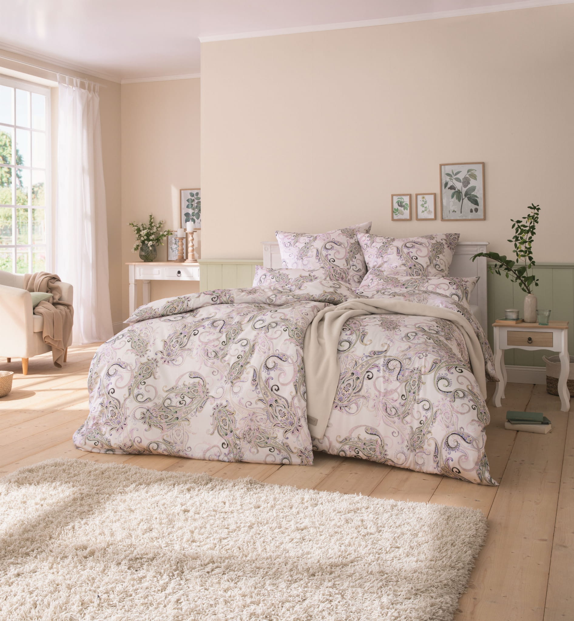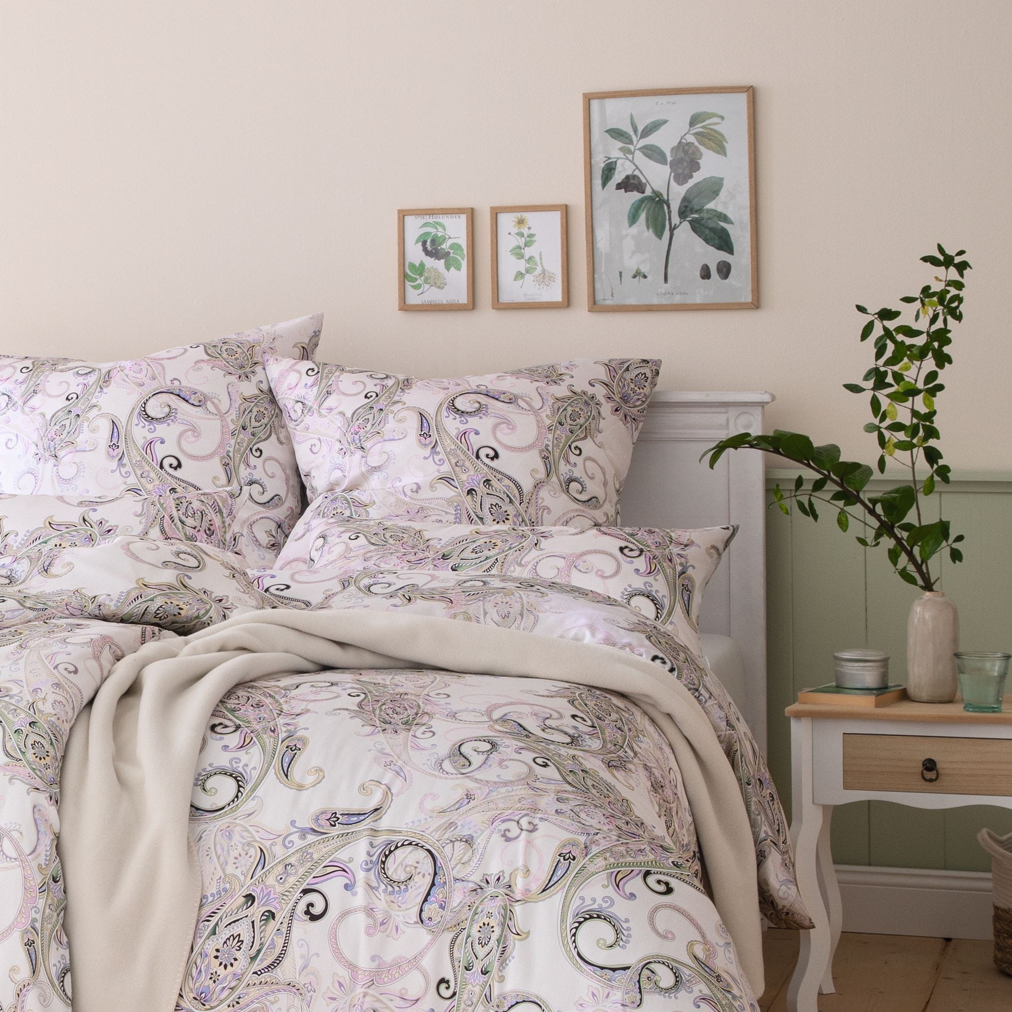 Pościel Caroline to zaproszenie do świata, w którym wnętrza budzą się do życia jak wiosenny ogród. Jej pastelowa paleta – odcienie lawendy, błękitu i świeżej zieleni – wprowadza do sypialni harmonię i lekkość, a subtelne akcenty czerni dodają całości wyrafinowania i wyjątkowego charakteru. Wystarczy kilka dekoracyjnych dodatków w komplementarnych barwach, aby Twoja sypialnia zamieniła się w przestrzeń pełną spokoju, elegancji i inspiracji.