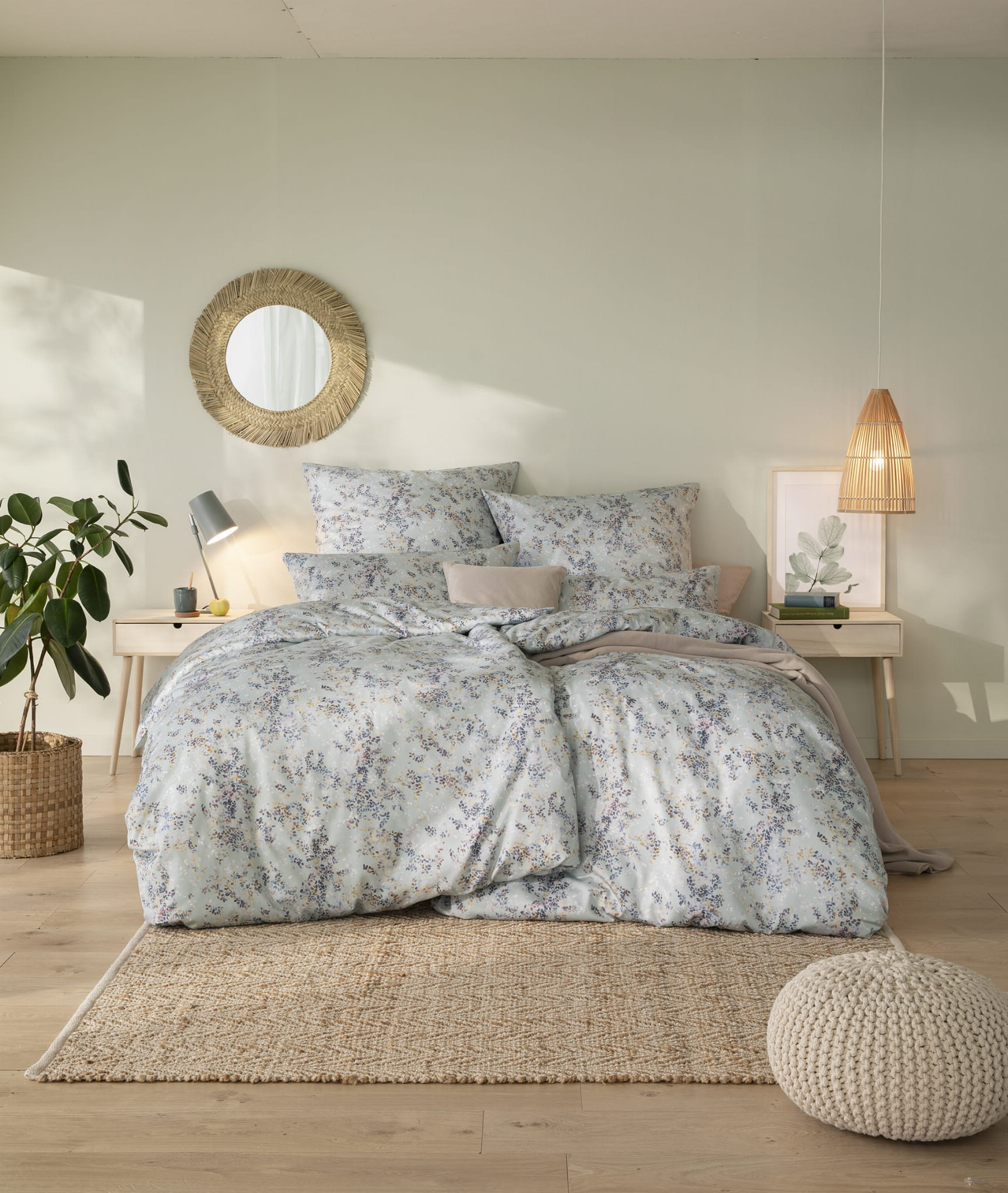 Pościel została wykonana ze 100% czesanej bawełny mako – jednej z najlepszych odmian egipskiej bawełny. Superczesane, długowłókniste włókna (Nm 70/1) gwarantują wyjątkową delikatność, a jednocześnie trwałość i odporność na wielokrotne pranie, nawet w 60°C. Dzięki atłasowemu splotowi tkanina zyskuje subtelny połysk oraz gładkość, które czynią sen jeszcze bardziej przyjemnym.