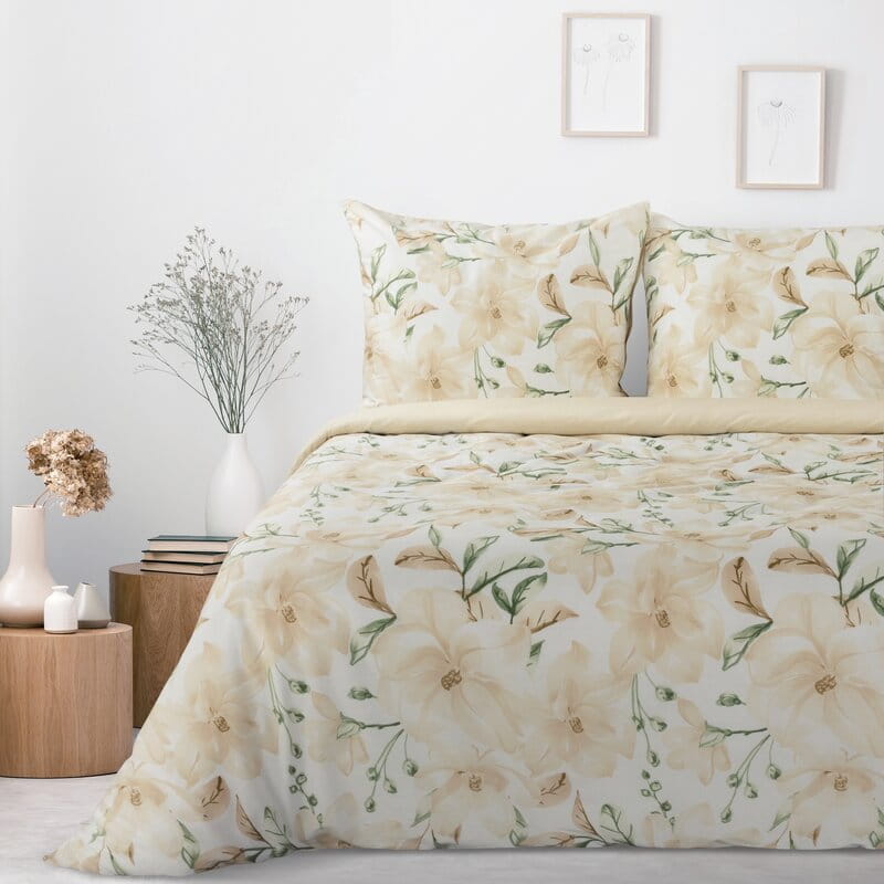 Naturalna bawełna: Wykorzystanie 100% bawełny oznacza, że komplet pościeli jest przewiewny i hipoalergiczny. Bawełna doskonale reguluje temperaturę ciała, zapewniając odpowiedni komfort cieplny zarówno w cieplejsze, jak i chłodniejsze noce. To idealny wybór dla osób o wrażliwej skórze oraz alergików.