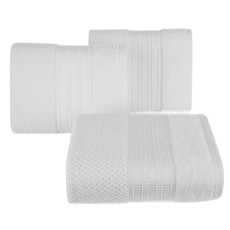 Ręcznik bawełniany o ryżowej strukturze z ozdobną bordiurą w paski. szerokość: 30 cm, długość: 50 cm, kolor: biały, Gramatura: 500 GSM, Skład: 100% bawełna: część ozdobna: 95% bawełna, 5% poliester