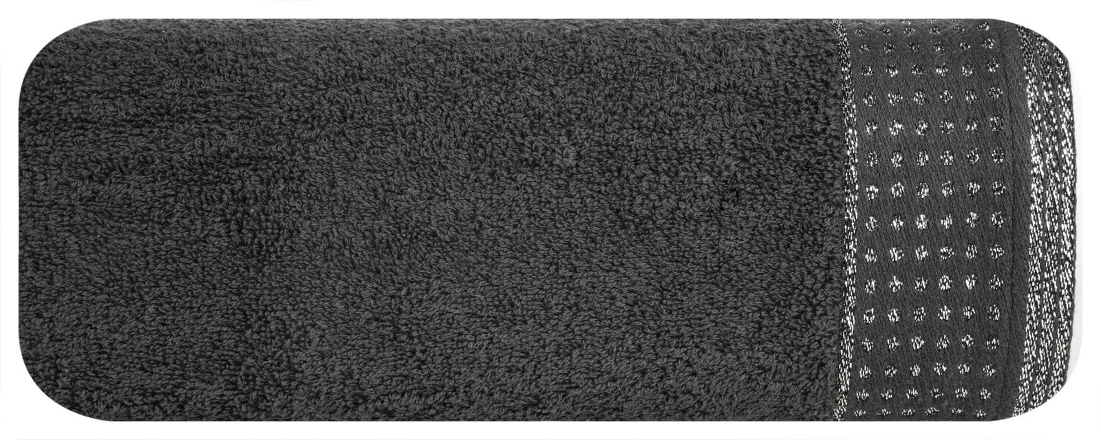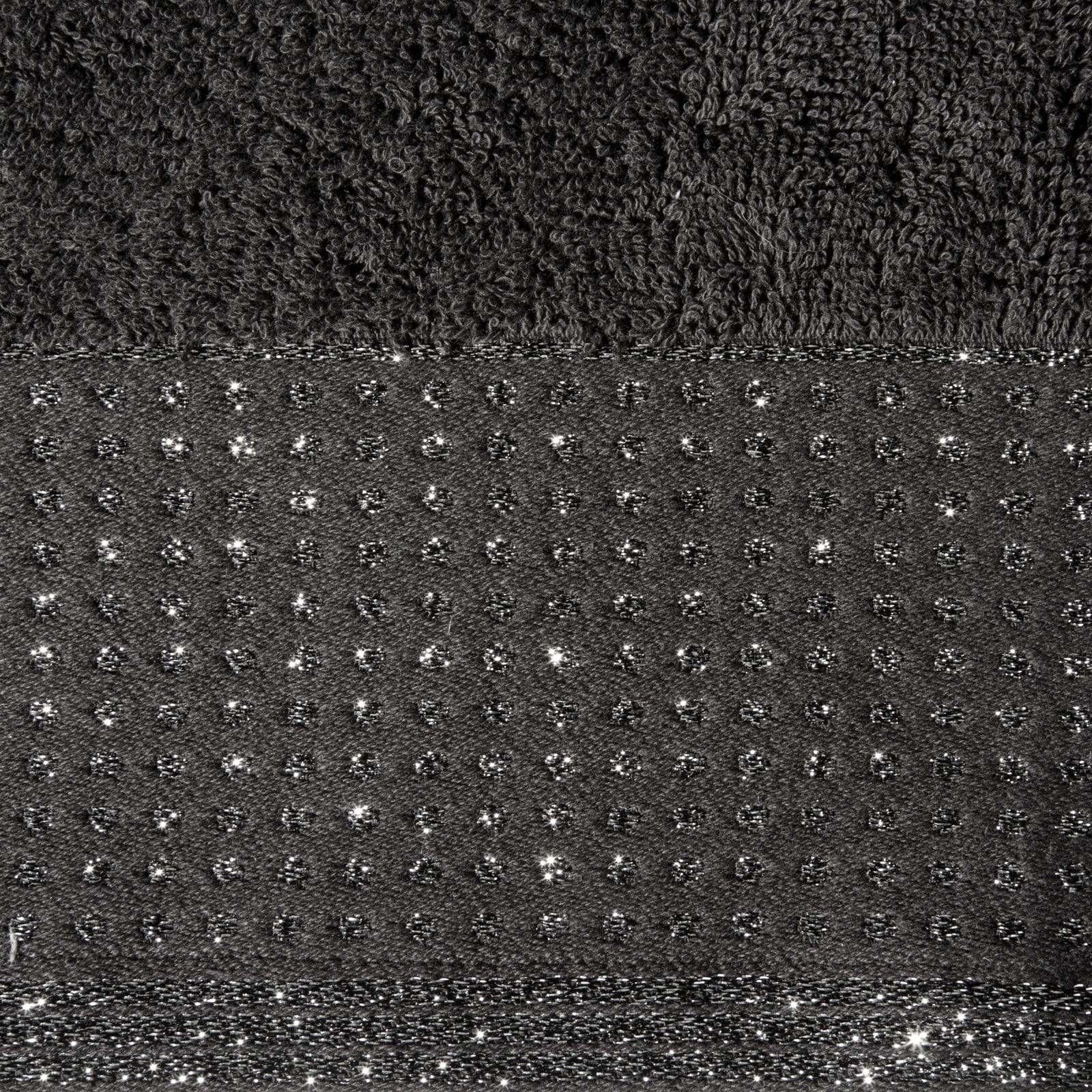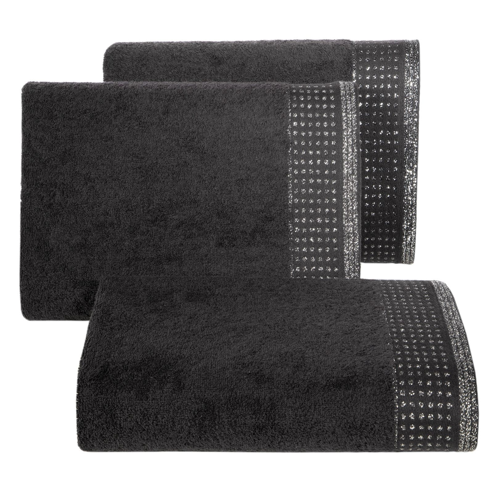Miękki ręcznik bawełniany frotte o wysokich właściwościach chłonnych dokładnie i delikatnie osusza po kąpieli. Bordiura z dodatkiem metalicznej nici lekko lśni. szerokość: 50 cm, długość: 90 cm, kolor: czarny, Gramatura: 500 GSM, Skład: 100% bawełna: 60% bawełna 40% nić metaliczna