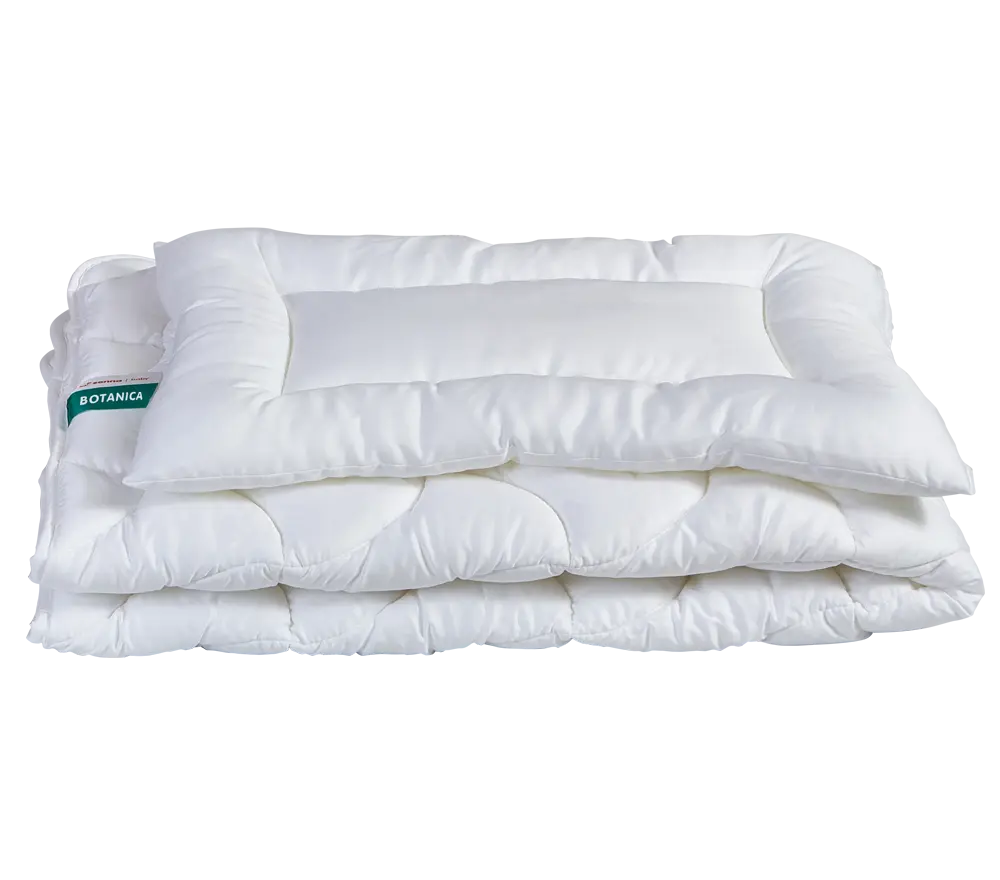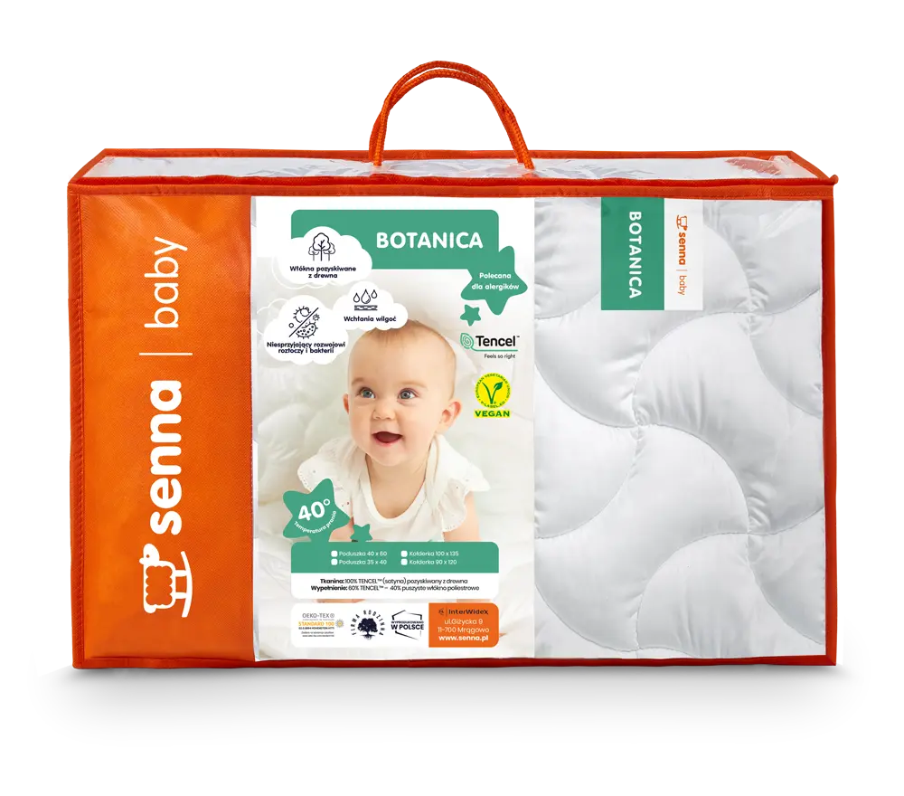 Kołdra i poduszka dziecięca BOTANICA firmy Inter-Widex to wyroby naturalne i antyalergiczna. Komplet składa się z włókien Tencel®, które są produkowane z celulozy drewna ekologicznego, są też biodegradowalne. Włókno nowej generacji jest w 100% naturalne, świetnie pochłania wilgoć i oddaje ją do atmosfery gwarantując komfortowy i suchy sen. Tkanina posiada wspaniałe właściwości termoregulujące – w lecie chłodzi, w zimie grzeje.