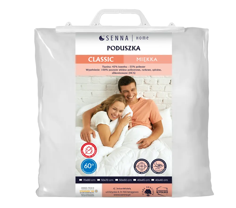 Poduszka Antyalergiczna CLASSIC firmy Inter-Widex to świetny wybór jeśli cenisz sobie komfort. Poduszka jest antyalergiczna. Została wypełniona granulatem poliestrowym COMFORT®, który zapewnia puszystość, trwałość i dużą miękkość. Pokrycie zostało wykonane z wysokogatunkowego policottonu czyli tkaniny bawełniano-poliestrowej.
