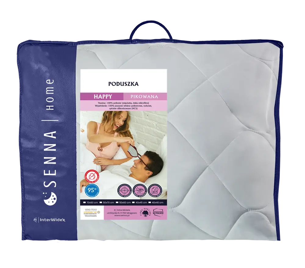 Poduszka HAPPY firmy Inter-Widex to przede wszystkim zadowolenie i komfortowy sen. Pokrycie zostało wykonane z wysokogatunkowej mikrofibry – tkaniny poliestrowej. Wypełnienie skręconymi włóknami poliestrowymi zapewnia trwałość, puszystość i miękkość poduszki.